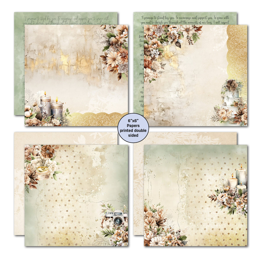 Experience the elegance of the 3Quarter Designs Wedded Bliss collection. Embrace the soft, romantic color palette of cream and green with hints of gold accents that will add a touch of glamour to your wedding themed projects. With delicate florals, charming candles and vintage details like a car and camera, you'll capture the perfect romantic atmosphere for your special projects.