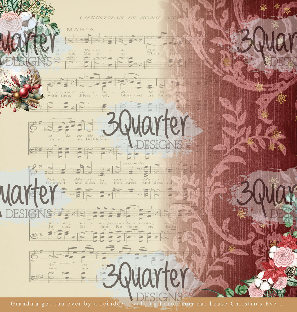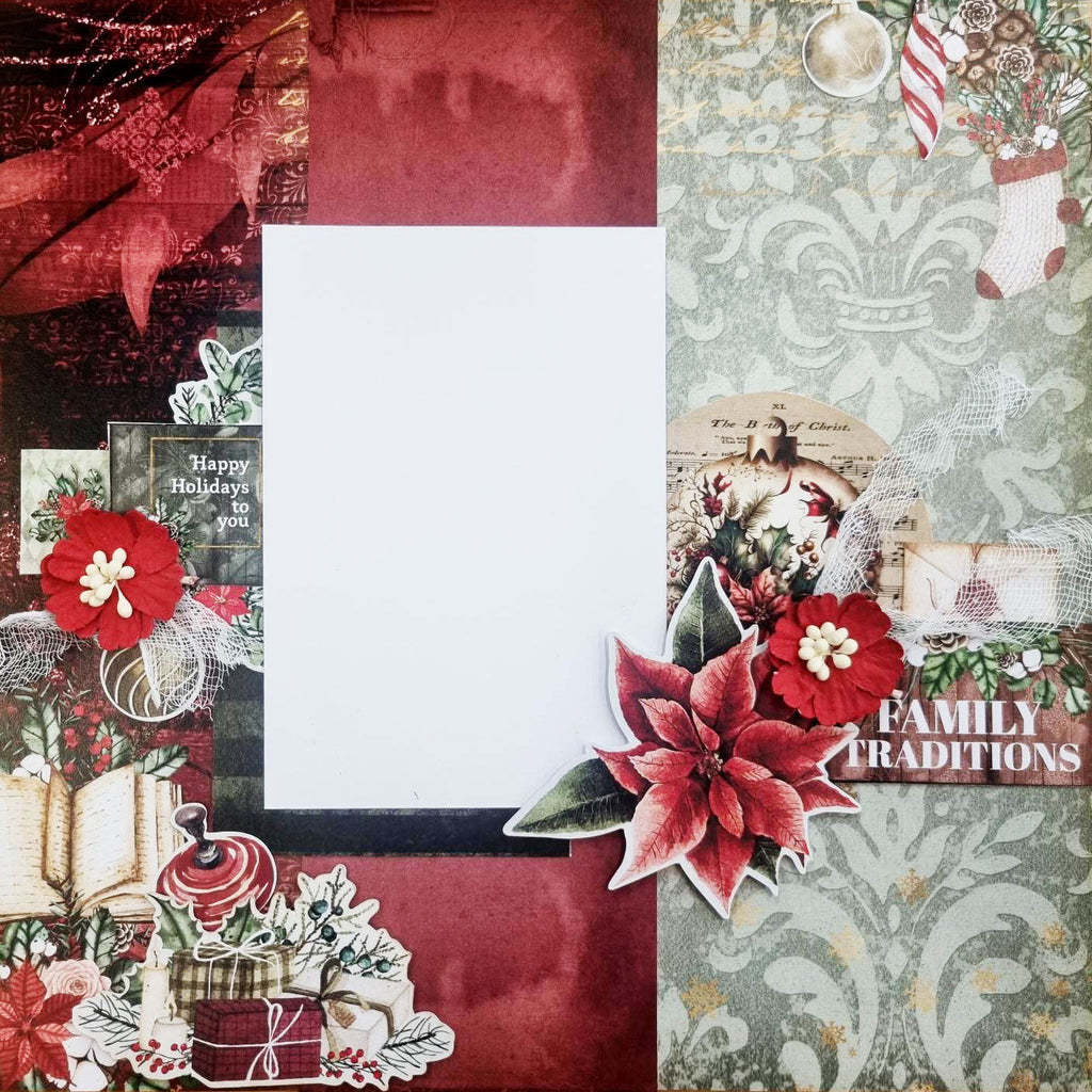 - 12 single sided 12" x 12" papers with festive red and green tones featuring traditional Christmas themed designs