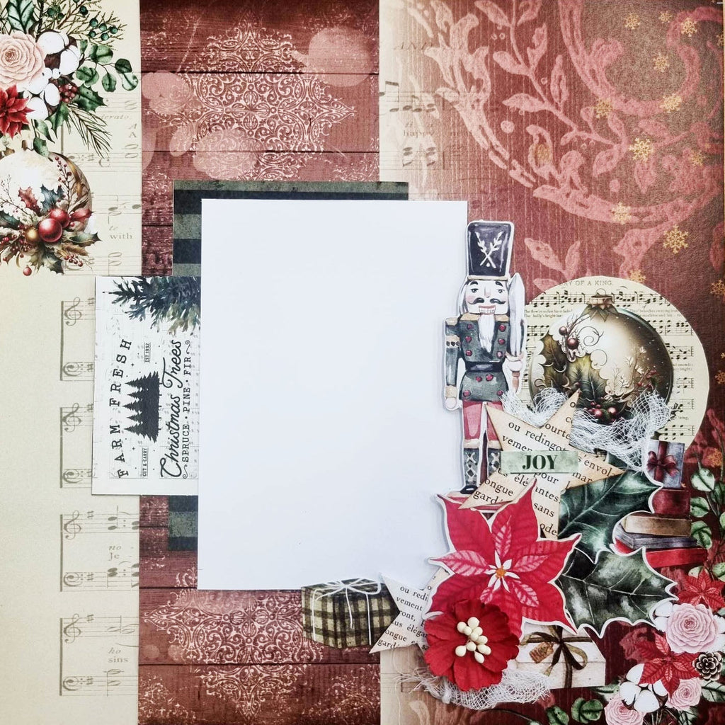 - 2 A4 die cut pages of ephemera featuring "December Wishes" elements with poinsettias, an evergreen tree, ornaments, gifts, a nutcracker soldier and more