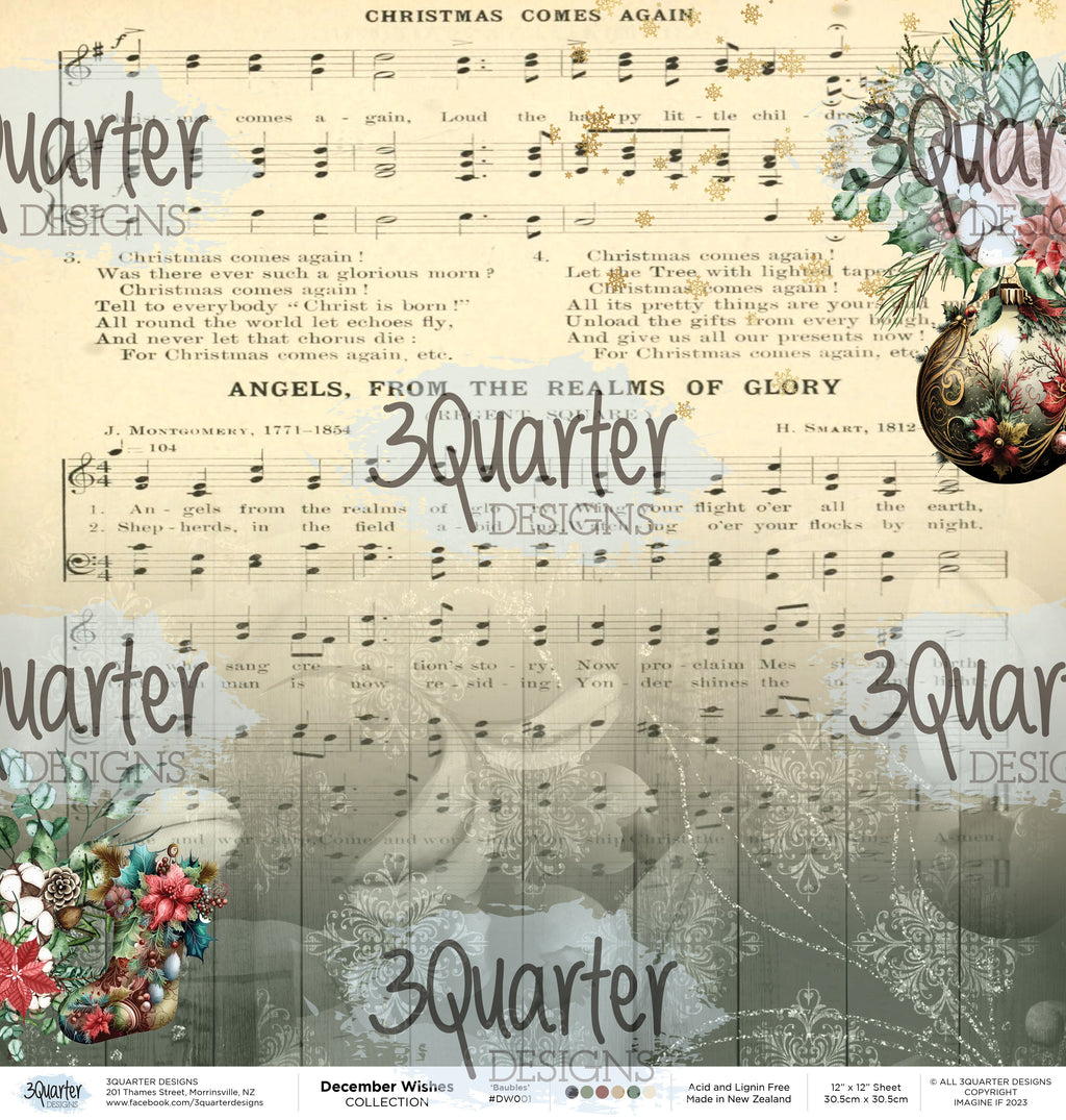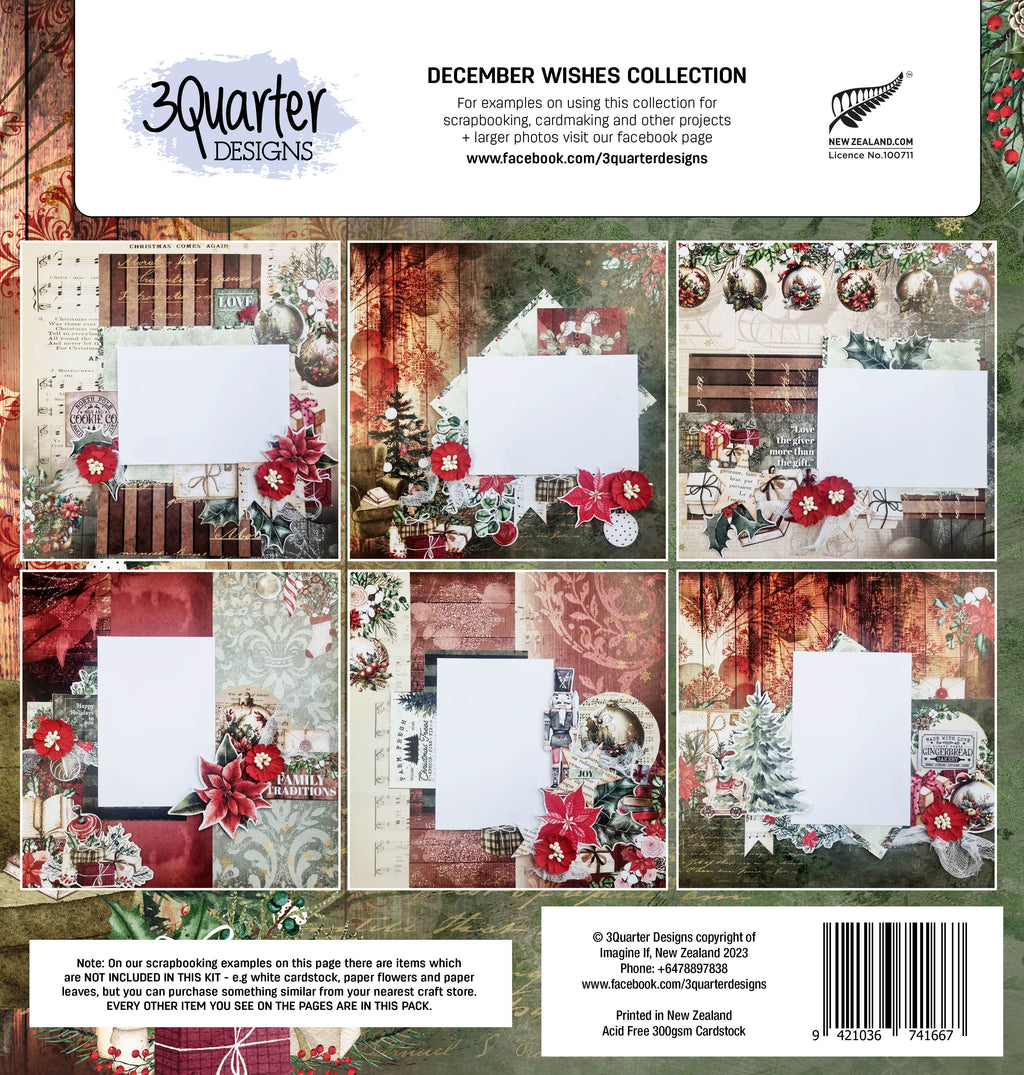 The December Wishes 12" X 12" Scrapbook Collection Pack with festive red and green tones has beautiful traditional Christmas themed designs paired with the designer's signature mixed texture look, creating the 3Quarter Designs unique and versatile much-loved look. Perfect for Christmas and Winter projects. The December Wishes collection includes a 12" x 12" Scrapbook Collection Pack, an 8" x 8" Paper Pack, a 6" x 6" Paper Pack and a 4" x 6" Card Pack. All sold separately. Designed and printed in New Zealand.