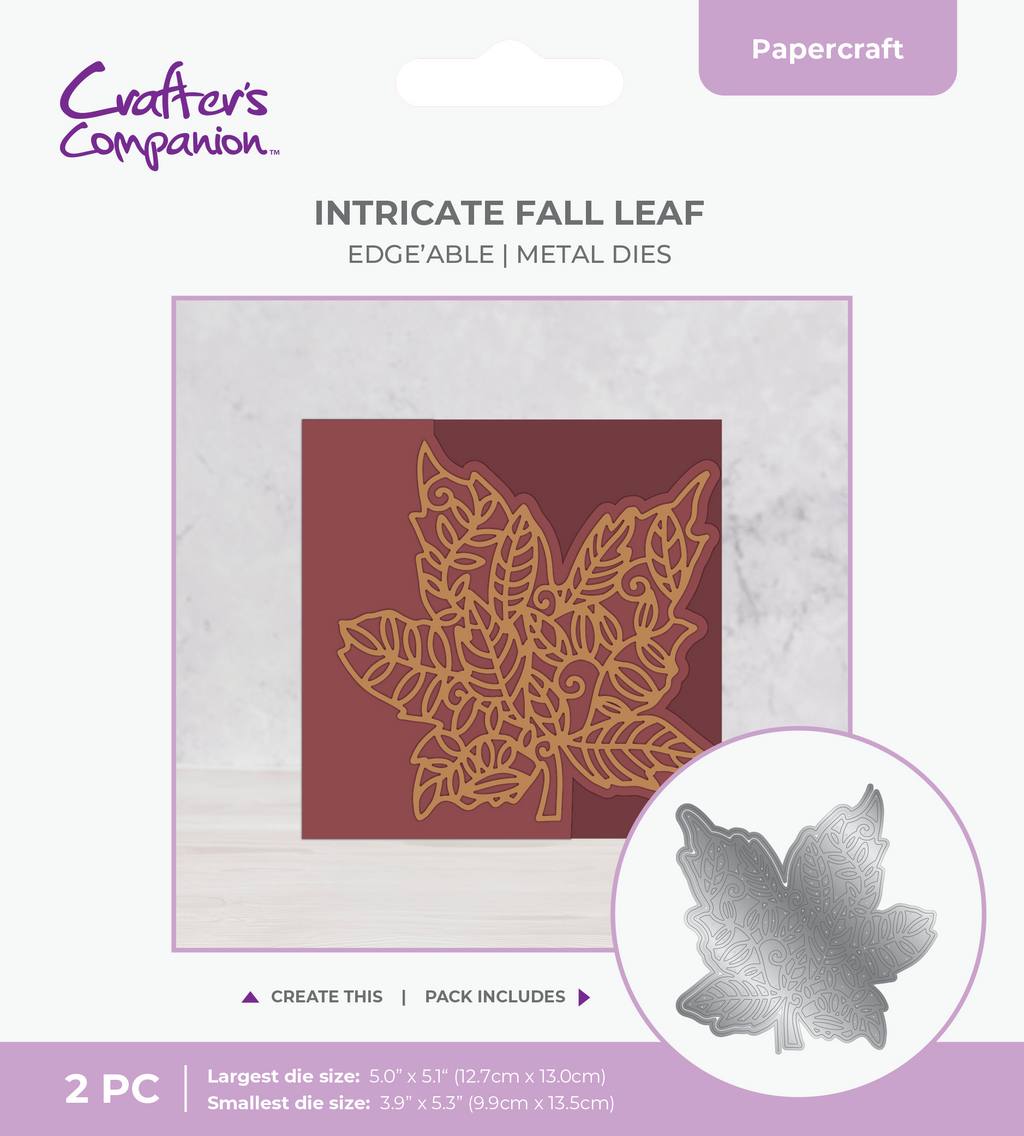 Add seasonal style to your makes with the Intricate Fall Leaf Die Set from Crafter’s Companion. This two-piece die set features a detailed maple leaf design filled with leaf detail. Use the edge die to cut shaped card fronts or leave it off to create standalone toppers for fall-themed cards, boxes, and more.
