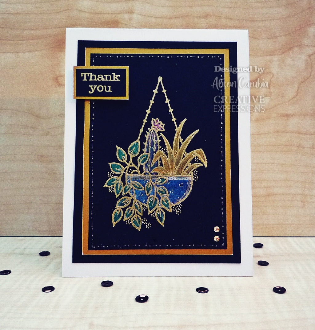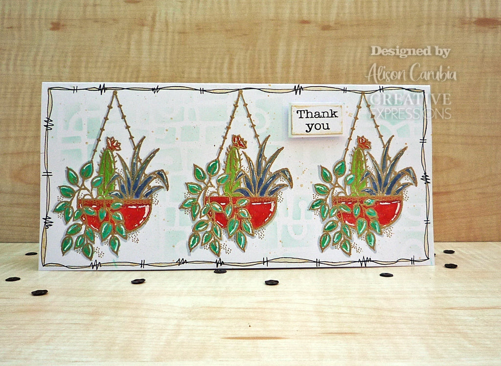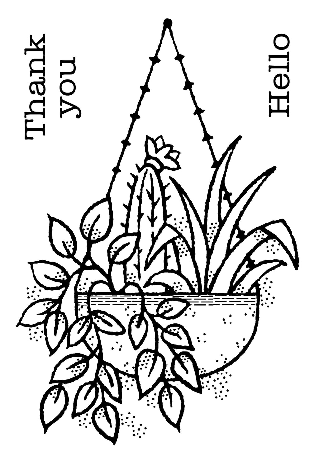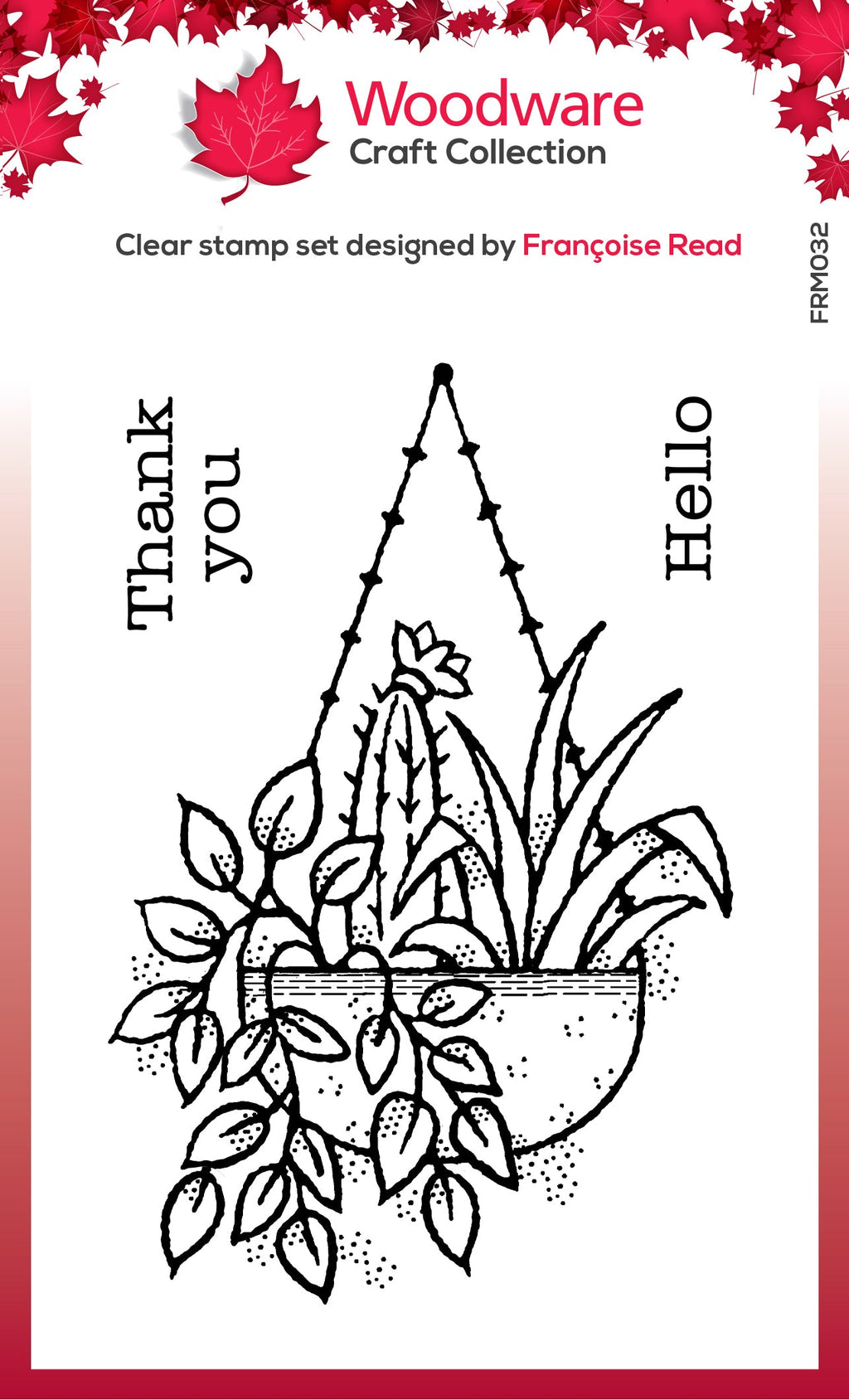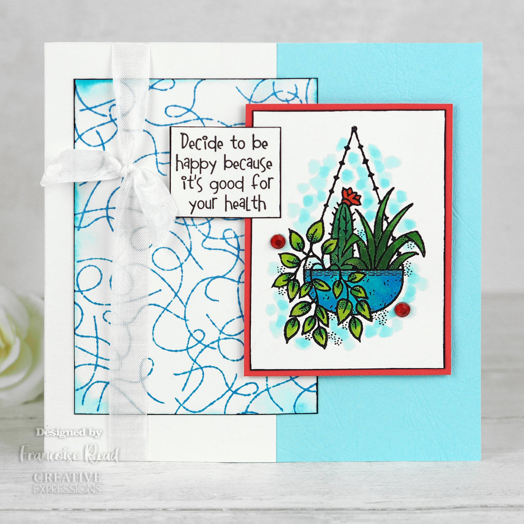 On trend stamp with a macrame style hanging basket and a pot filled with plants including succulents. Add a personal touch with your favourite colouring medium. Designed by Francoise Read. These stamps would be perfect for cards and scrapbook pages as well as mixed media or fun décor projects. Ready to mount on an acrylic block the stamps can be used with ink pads, paint, or used with pigment ink and embossing powder. They are suitable for use on paper, fabric, or any other surface depending on the ink choice. Clean your stamps with a wipe, damp cloth or under warm running water depending on the medium you use. Designed and made in the United Kingdom. 9.7 x 6.6 cm (3.8 in x 2.6 in) – three stamp set.