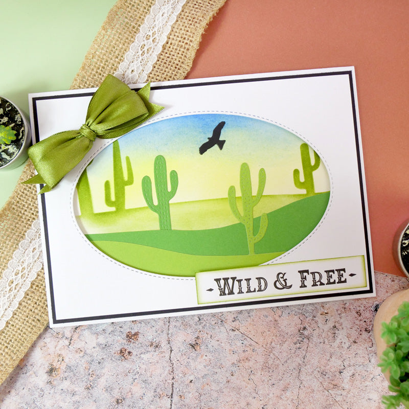 Create country-inspired scenes with the For the Love of Masks - Canyon Landscapes A5 mask. The mask includes two desert canyon-inspired landscapes along with a silhouette cactus view. Ink through the mask using Prism Ink Pads to create dimensional place for die cuts and stamped images to sit upon. Create unique arrangements by inking small sections and create larger scenes by tiling the designs as long as desired.