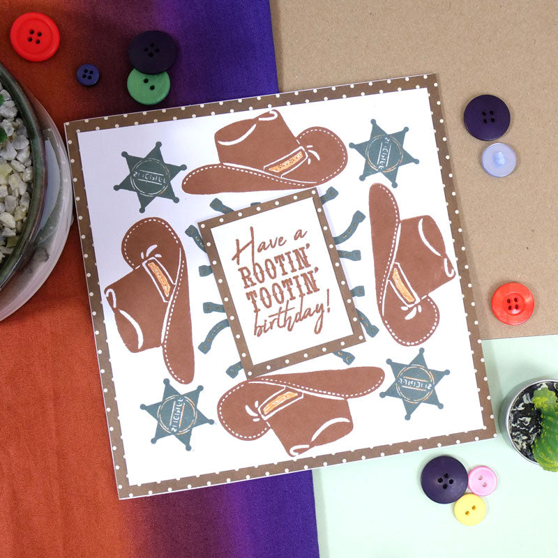 The set also includes a silhouette sheriff’s badge that can be used to embellish sentiments further or can be stamped multiple times to create borders, corners and even backgrounds.