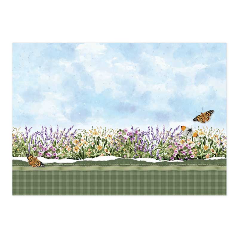 The Garden Treasures collection is a crafters dream full of torn paper textures, blue skies, cottage garden florals, and beautiful garden animals all in a soft watercolour style. Animals featured include: a fox, rabbits, mice, badger, sparrow, hedgehogs, ducks, butterflies and bees. Patterns include torn and natural paper textures, checks, florals and collaged imagery, all adorned with matching sketched garden elements to give an eclectic gardeners journal feel. Each topper has its own colour theme - moss green, lavender purple, dusky rose and mellow yellow, complimented by natural cream stone and blue skies for a soft natural colour palette throughout.