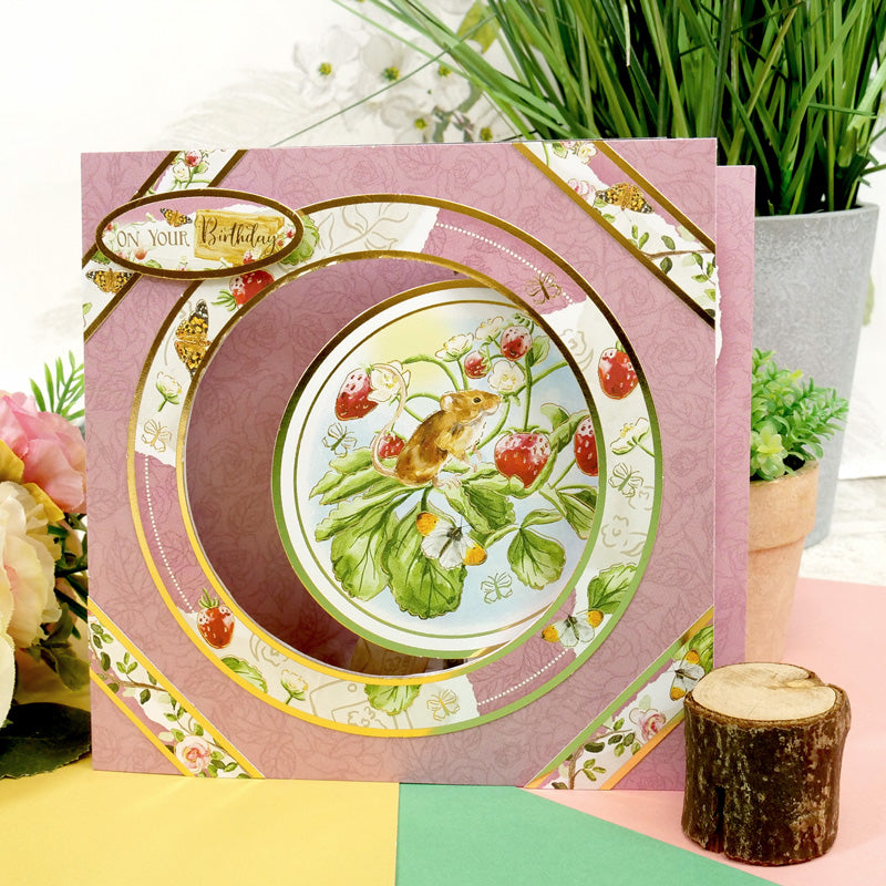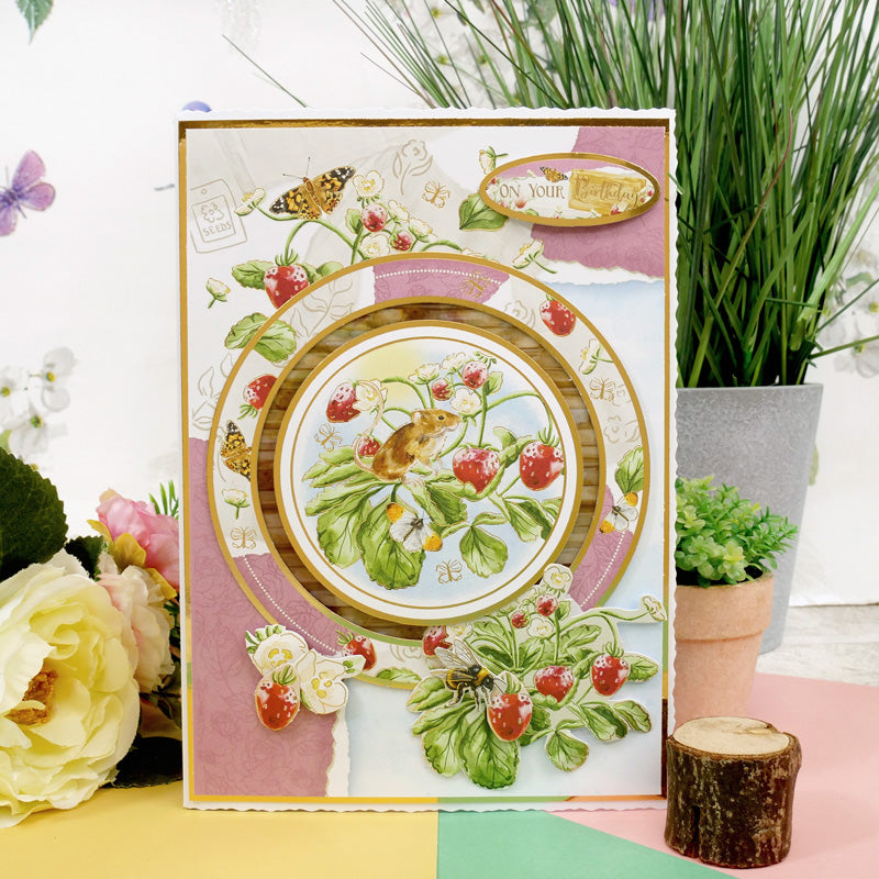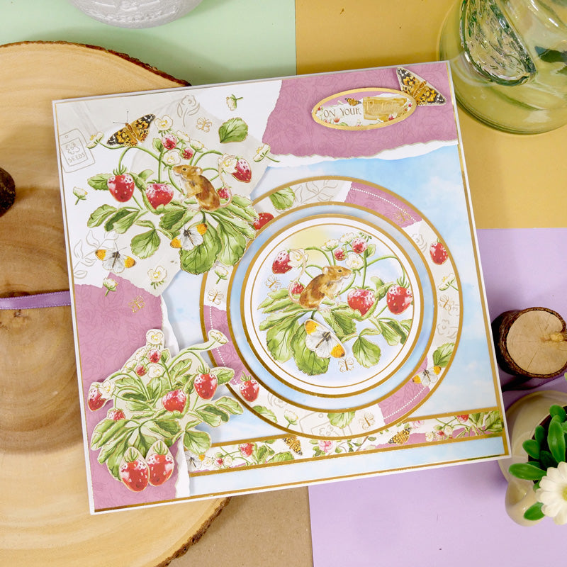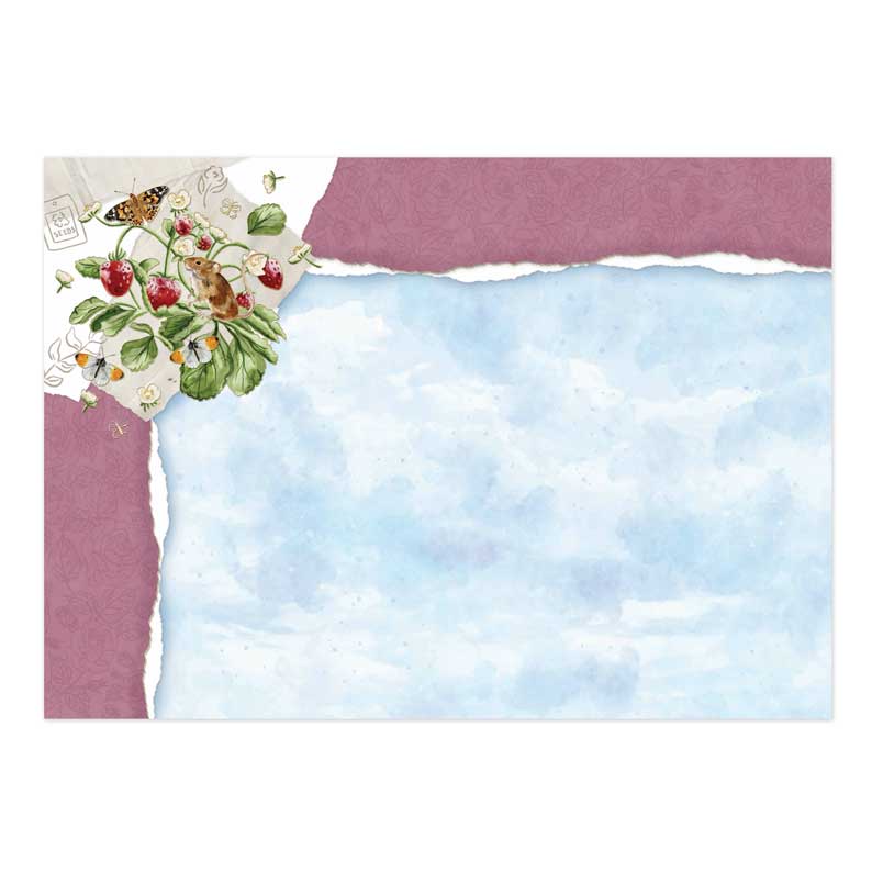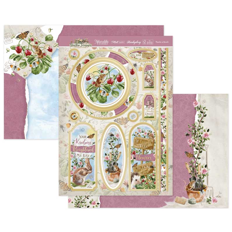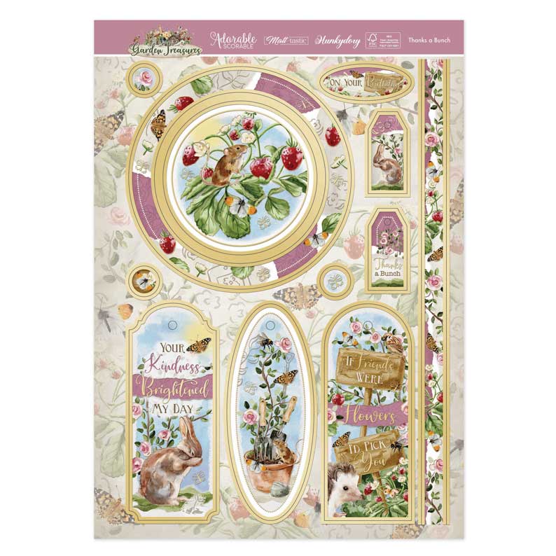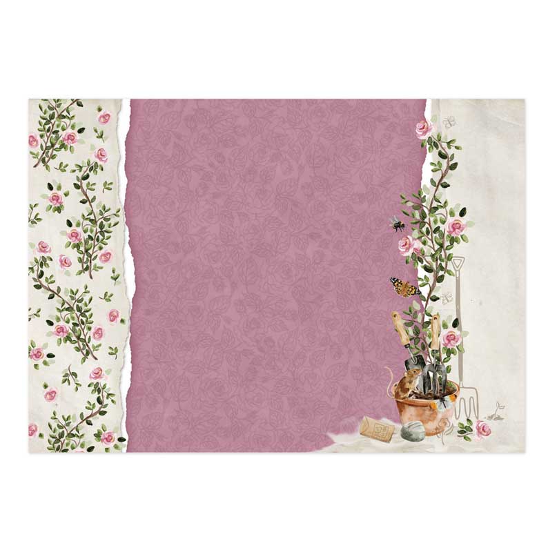 The Garden Treasures collection is a crafters dream full of torn paper textures, blue skies, cottage garden florals, and beautiful garden animals all in a soft watercolour style. Animals featured include: a fox, rabbits, mice, badger, sparrow, hedgehogs, ducks, butterflies and bees. Patterns include torn and natural paper textures, checks, florals and collaged imagery, all adorned with matching sketched garden elements to give an eclectic gardeners journal feel. Each topper has its own colour theme - moss green, lavender purple, dusky rose and mellow yellow, complimented by natural cream stone and blue skies for a soft natural colour palette throughout.