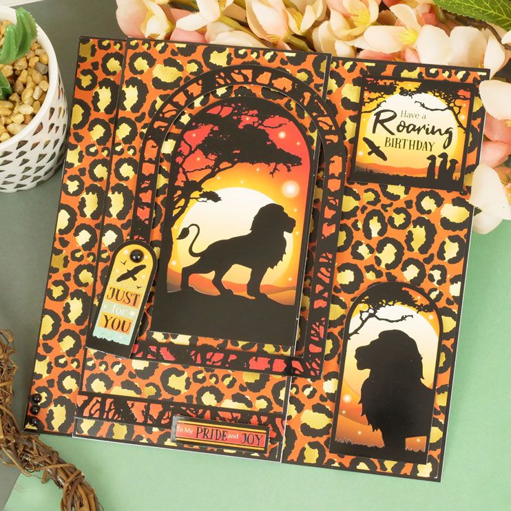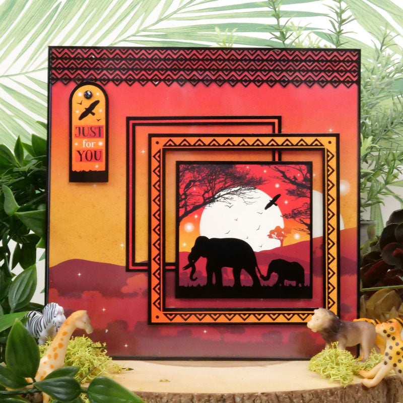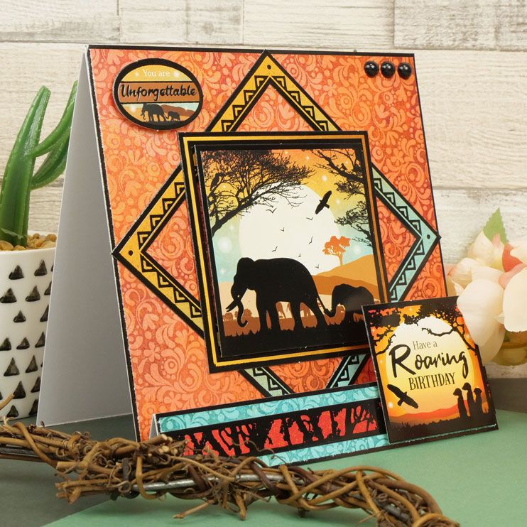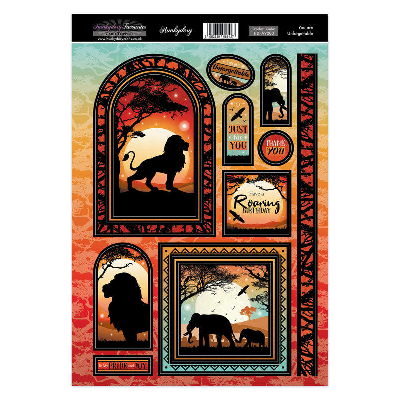 The You are Unforgettable Topper Sheet features lions and elephants on bright sunset backdrops. All foiled in midnight black foil to give a strong silhouetted look. Great for kids but also for animal lovers of all ages.