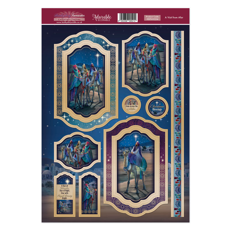 Celebrate the true meaning of Christmas with the A Visit from Afar Topper Sheet. This beautifully rich topper sheet, includes traditional scenes from the nativity story, with the three kings delivering their gifts on camelback. Decadent colours of dark blue and plum with lots of rich gold foiled sparkles and accents add too the elegant feel.