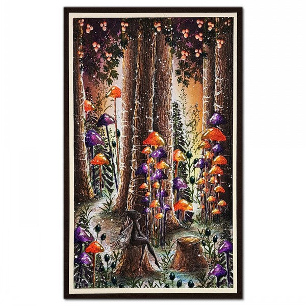 An individual stamp featuring an illustration of a group of many toadstools. The toadstools have long slender stalks and small pointed caps. They differ in height and cap size and are perfect for creating patterns or depth in a scene. Stamp them as focal points or within borders for a fairytale frame within the Wild Leaf Corner or near the Moss Cap set.
