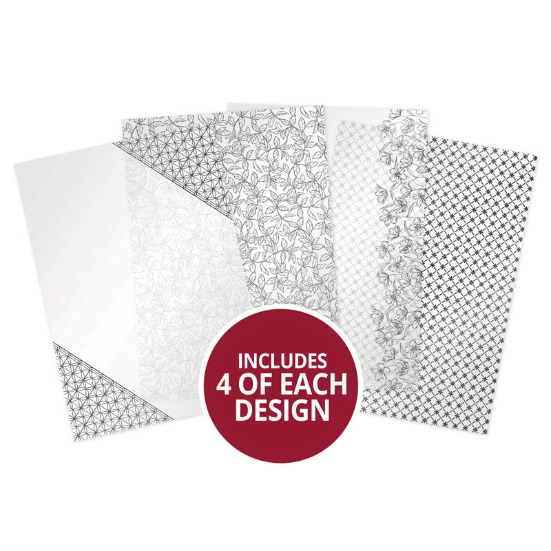 The Stained Glass Wonderful Wildlife Luxury Foiled Acetate features 4 different designs; decorative window corners, a decorative floral landscape border, an all over leaf design and an all over geometric window design. Each sheet is beautifully foiled in special midnight black foil which will complement the Stained Glass Wonderful Wildlife collection beautifully.