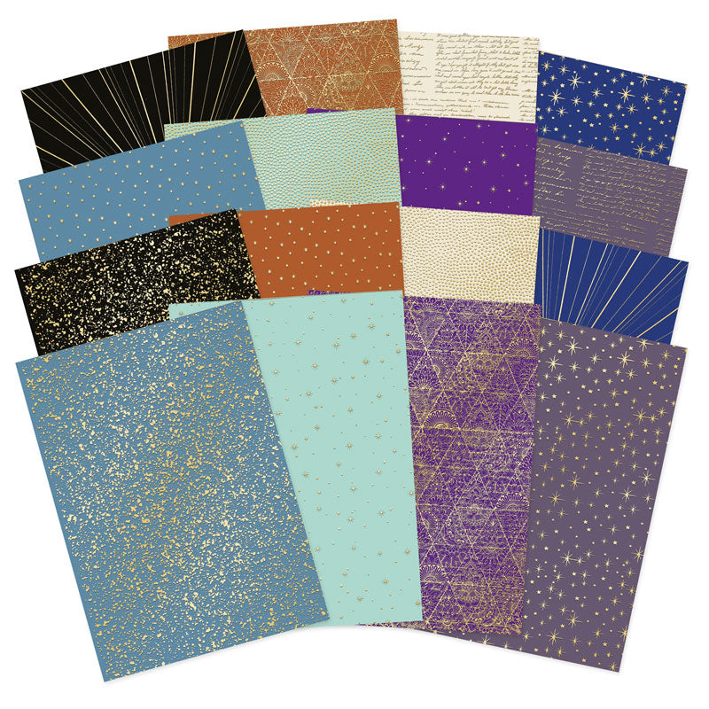 Handpicked to complement the Starbound Wonder Collection perfectly, we have Foiled Edge-to-Edge Cardstock. There’s 16 sheets of Adorable Scorable A4 cardstock featuring 8 different colours that are embellished with brilliant rich gold foil. The fabulous edge-to-edge foiled designs featured include: Twinkling Sky, Mystic Mosaic, Stippling Dots, Little Stars, Stardust, Wonderful Words, Shining Bright and Starbeams. The 8 different patterns are expertly gold-foiled onto our quality Adorable Scorable which in this special selection includes the beautiful colourways: Amethyst, Aqua, Blue Steel, Ivory, Mauve, Midnight Black, Navy and Warm Cinnamon. Each colour comes in 2 different patterns meaning all 16 sheets are completely individual! This amazing board will add a real stand-out touch to crafter’s makes, whether that is for backgrounds, matting and layering, box-making and more! Adorable Scorable takes a deep score with no damage to the board or loss of vibrancy to the print. Its powerful smooth seal eliminates the risk of accidental colour transference and keeps your cardstock clean. The 8 different colours, each foiled with 2 different designs are: Amethyst Aqua Blue Steel Ivory Mauve Midnight Black Navy Warm Cinnamon
