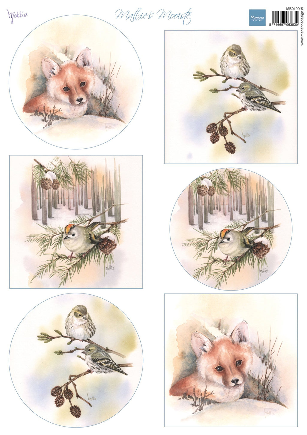 More stunning water colored wintery images by Mattie de Bruine. Beautiful soft colors that always match Marianne's design papers. Images of foxes and birds in wintery forest scenes.