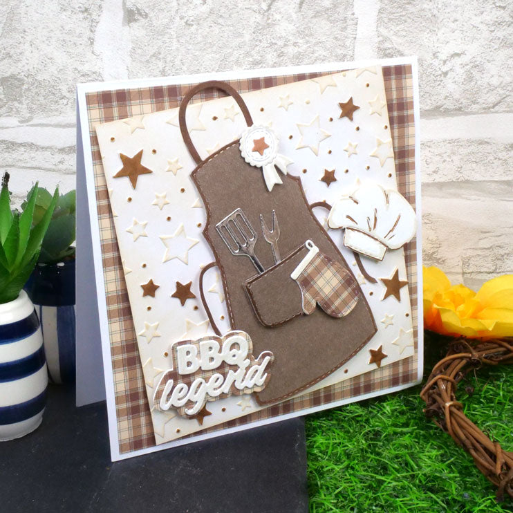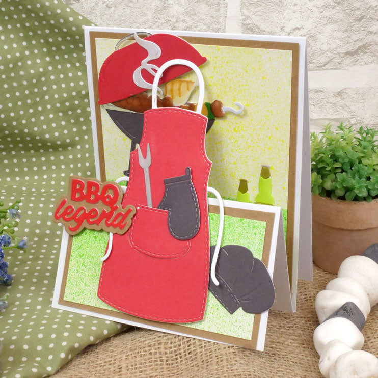 Create sizzling centrepieces and legendary cards with the Moonstone Dies - BBQ Legend die set! The set includes a large apron centrepiece, complete with stitched details and a large pocket. Decorate the apron with the oven glove, chef hat, cooking tongs, spatula and BBQ fork. These items make cards for chefs, inspiring cooks, BBQ enthusiasts and more! Decorate the apron with different colours and embellishments from your craft stash to create baking cards, craft aprons, DIY cards and more! Complete your cards with the ‘BBQ legend’ sentiment and co-ordinating mat layer.