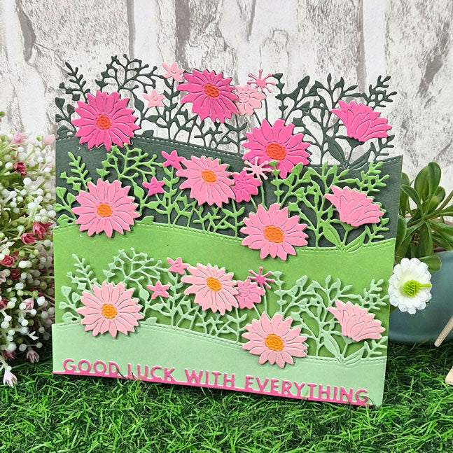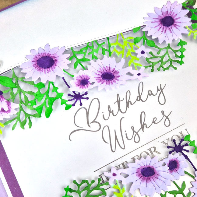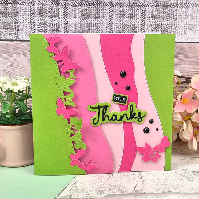 Cut stunning designs into the top edge of a 6” wide piece of cardstock for beautiful panels and even into card blanks for shaped card edges. Moonstone Dies - On-The-Edge - Butterflies & Flowers die set includes two fabulous designs: the first features a sweet trail of butterflies in flight and the other a lovely arrangement of wildflowers and foliage, both with a curved stitched border. Use the dies alone or try pairing them together to create unique scenes.
