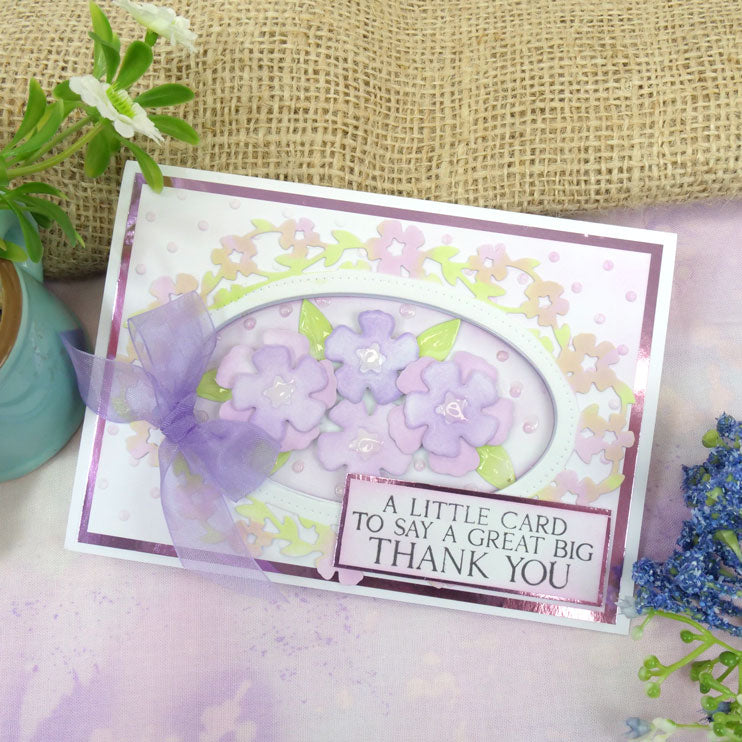 The Moonstone Dies - Simply Elegant Flowers & Leaves includes two large flowers, three small flowers and four leaves, each with debossed details. Cut from coloured cardstock, papers, Shimmer Cardstock, Mirri and more, and shape the petals and leaves for a realistic effect. Arrange the elements to create gorgeous centrepieces, borders, corners or even backgrounds. Decorate any style or theme of card with the pretty flowers.