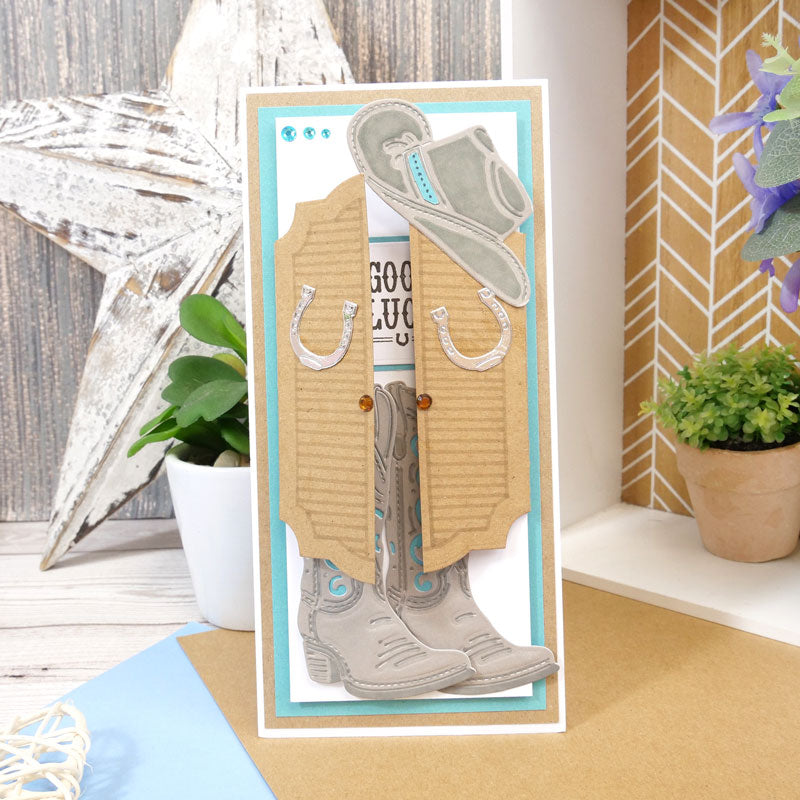 Moonstone Dies - Sheriff’s Hat & Boot die set includes a fantastic sheriff boot, decorated with classic swirl details and stitching. Cut two boots to create a pair, ideal for a centrepiece alongside the cowboy hat and sheriff’s badge. The stunning level of detail on all three dies allows for easy colouring using Prism colouring mediums, or alternatively cut from coloured or lightly patterned papers.