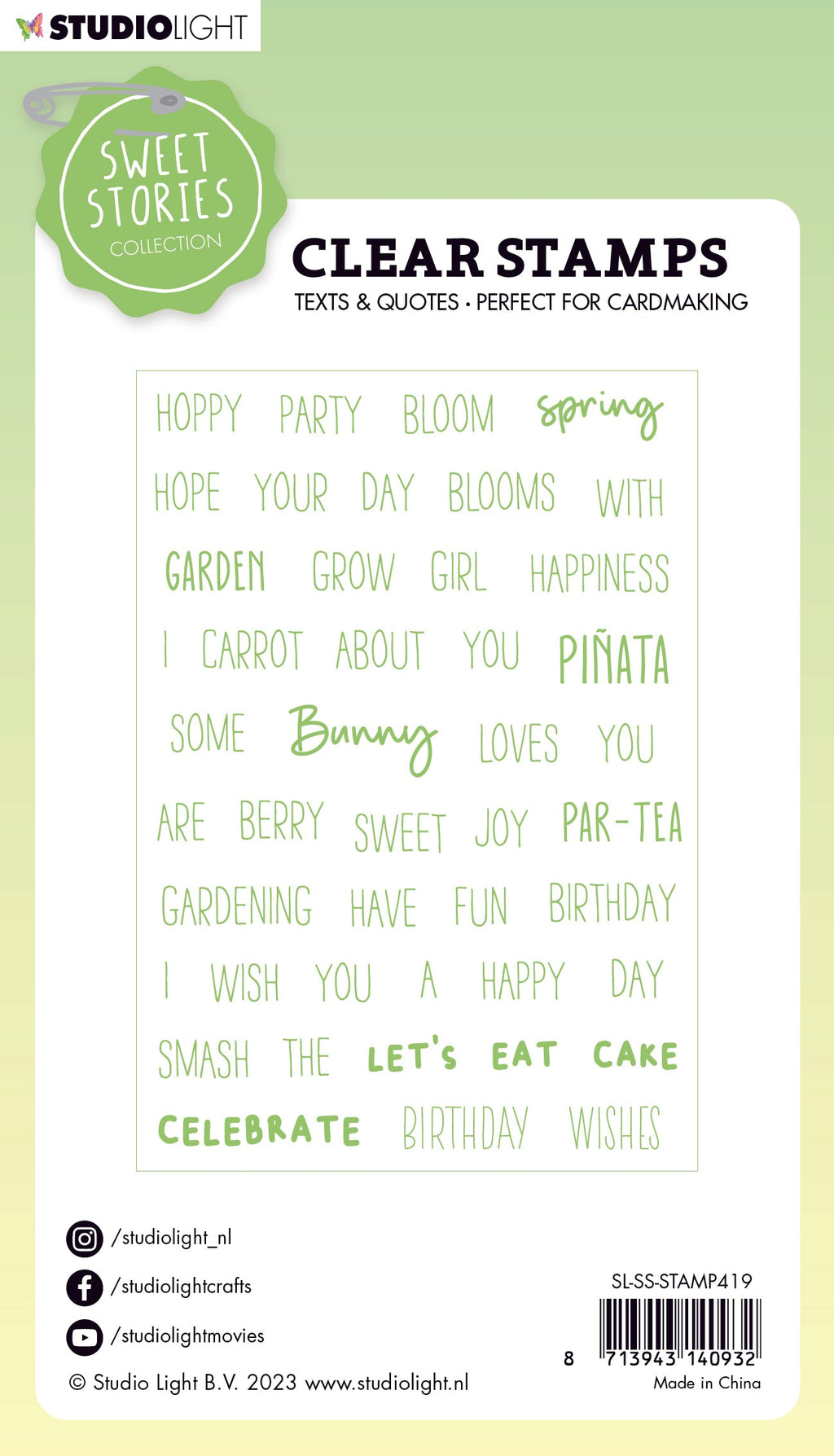 This clear stamp set includes text 'Spring', 'Garden', 'Birthday', 'Wishes', 'Celebrate', 'Bunny', 'Hoppy' and many more. They can be used for scrapbooking, journaling and card making.