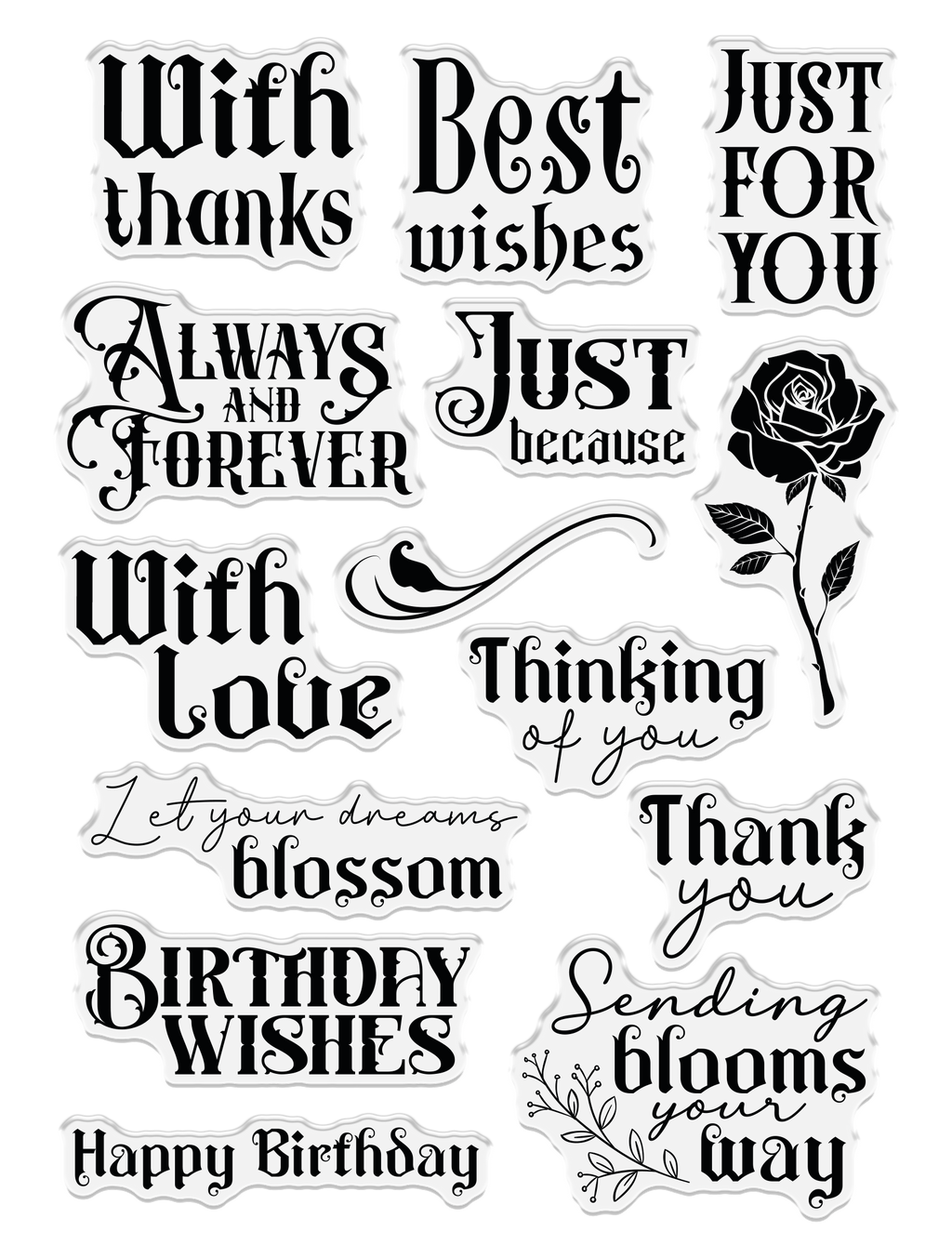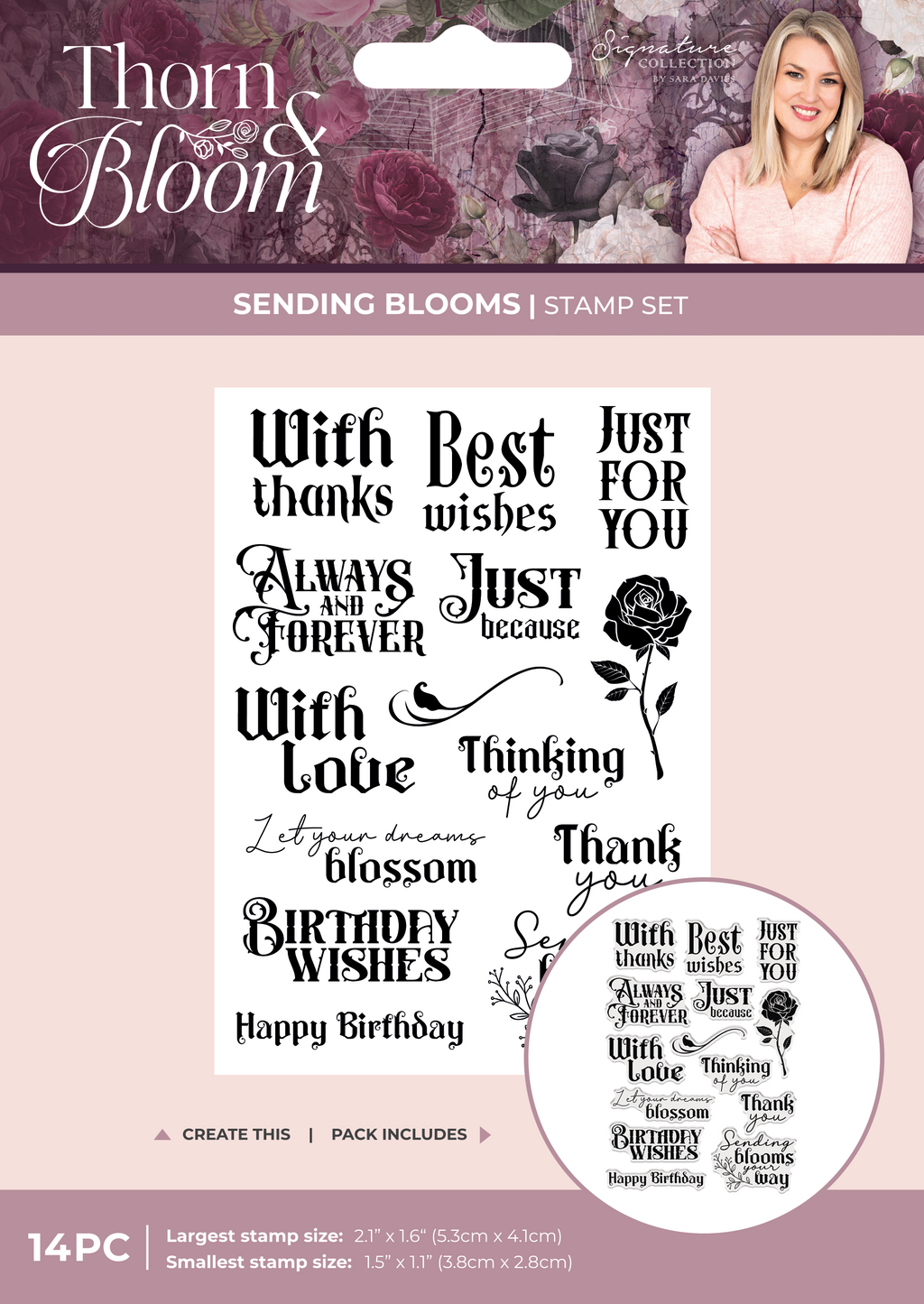 Give your crafts and projects an encouraging sentiment with a classic gothic look with the Sending Blooms Clear Acrylic Stamp Set from the Sara Signature Thorn & Bloom collection by Crafter’s Companion. This set of 14 clear stamps feature a classic gothic font and encouraging sentiments, perfect for your next handmade greeting card, bespoke gift box, and more.