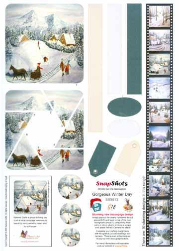 Snap Shots - Gorgeous Winter Day Snap shots are simply stunning that has the "Camera Iris" effect. The 3D Precut sheets are specially designed that included banners and tags which will help finish off your projects. Beautifully hand painted by Israeli artist Ilunia Felczer.