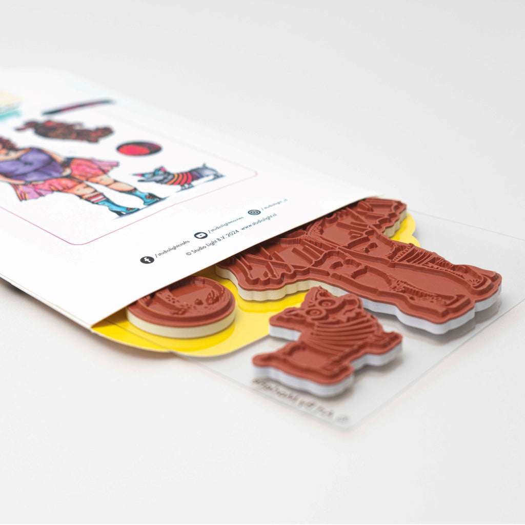 Add a touch of whimsy to your papercrafts with this stamp set. These quirky stamps feature a woman, 2 fun dogs and a ball. Perfect for adding a playful element to your projects. Let your creativity soar with these stamps! Part of Art By Marlene's Signature Collection.