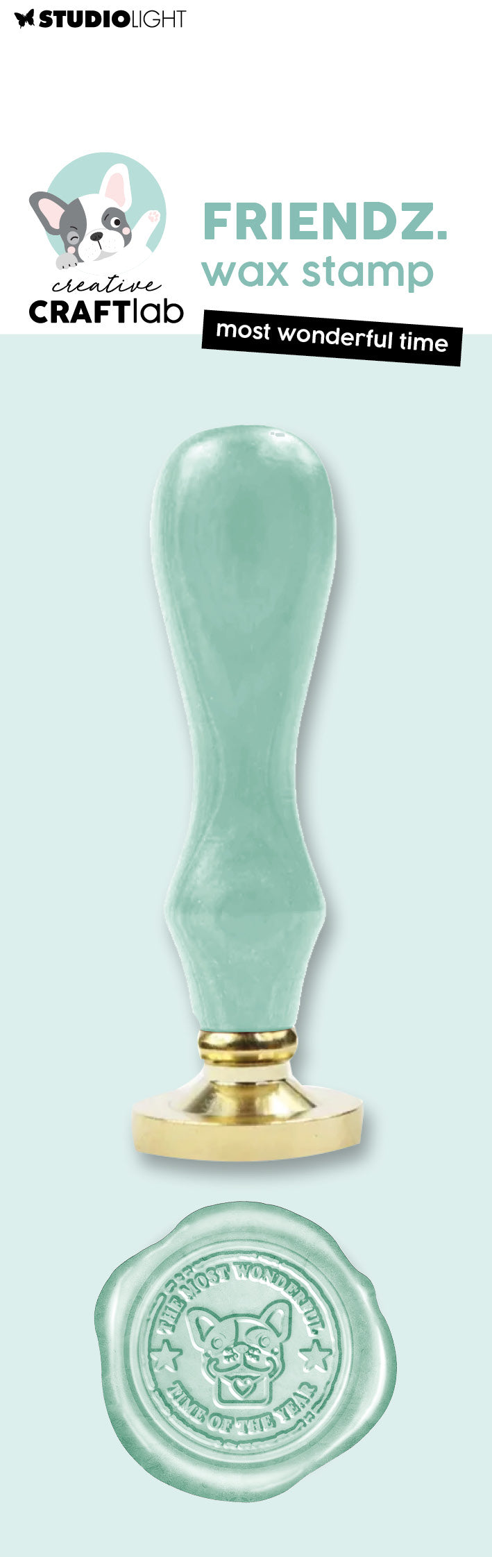 This wax stamp has a wooden handle that supports a round brass seal stamp design on its end. The stamp has an image of a cute dog and the sentiment 'The Most Wonderful Time Of The Year' perfect for Christmas projects. Add elegant and unique wax seal accents to your cards, envelopes and more! Part of the Creative Craft Lab Friendz collection.
