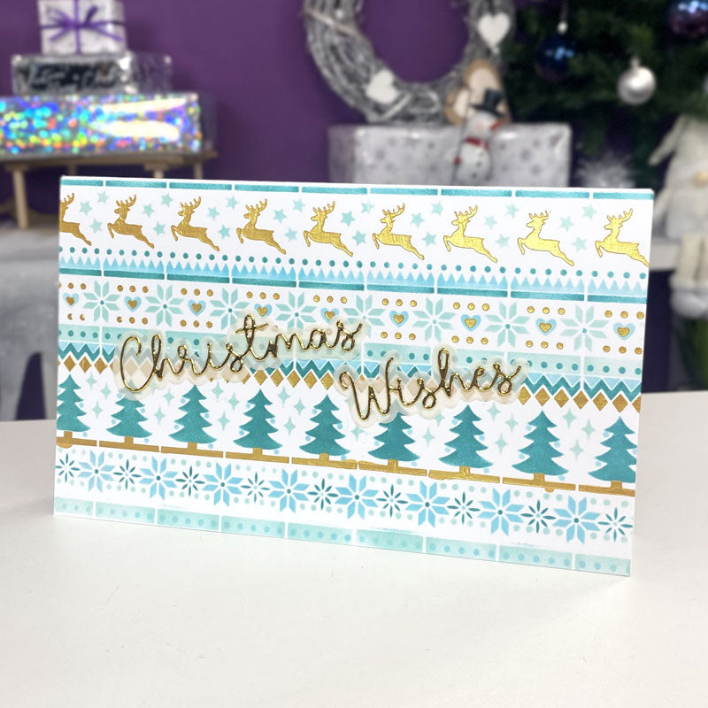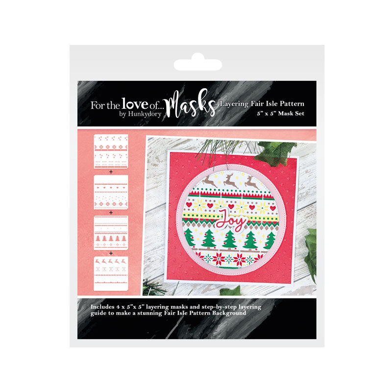 The For the Love of Masks - Layering Fair Isle Pattern set includes four 5” x 5” masks, each labelled for ease with A, B, C and D, whilst two corners are arched for easy alignment. Ink through each mask using the guide included and the suggested Prism Ink Pad colours to create a fabulously festive Fair Isle patterned background. Although sized to fit a 5” x 5” card, the Fair Isle pattern can also be tiled as many times as desired to create bigger backgrounds for larger cards or projects. Once complete, pair with your favourite sentiment and mat upon a card blank.