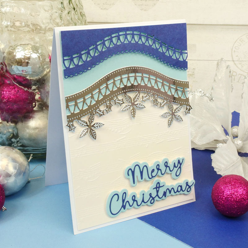 The Moonstone Dies - Poinsettia Border Strips is a must-have for your Christmas crafting. Each intricate border strip follows the same lovely arch shape so borders can be layered perfectly. The poinsettia border features three poinsettias along with holly leaves, and can be cut to create shaped card fronts or panels. Layer the additional poinsettias onto the border for added dimension or simply embellish any of the other border strips. Mix and match the scalloped edge border with the two cut-in lace strips to create a variety of intricate edges. Also included is a straight edge border that can be used for a straight edged border or can be rotated to create a panel that compliments the arch for something completely different.