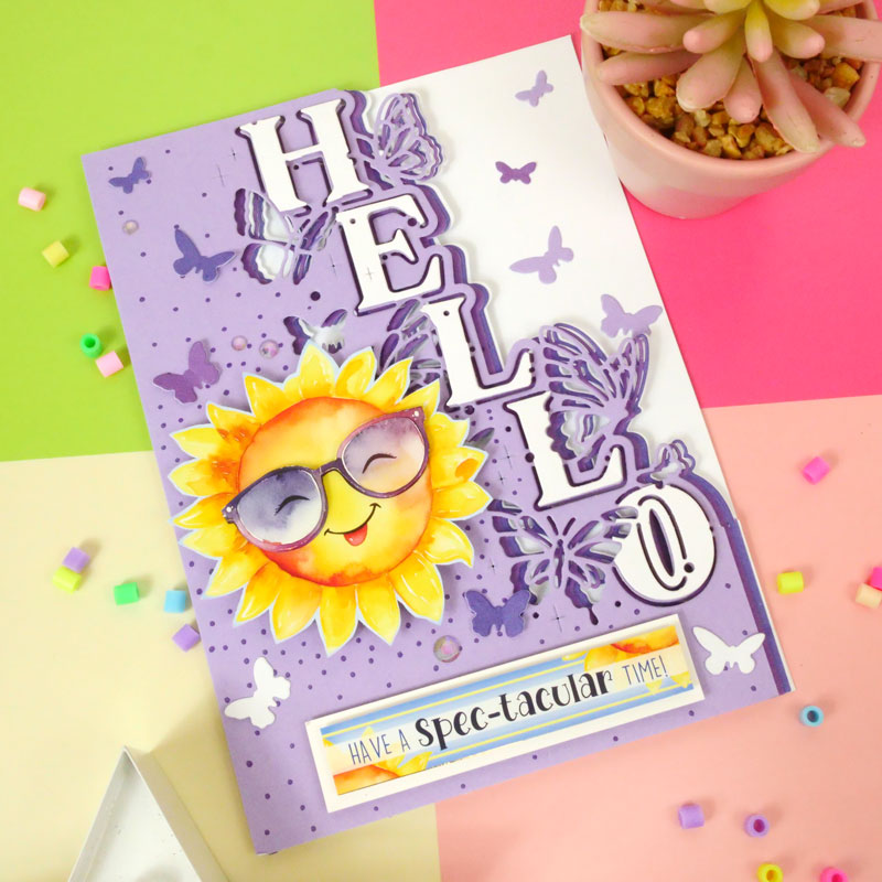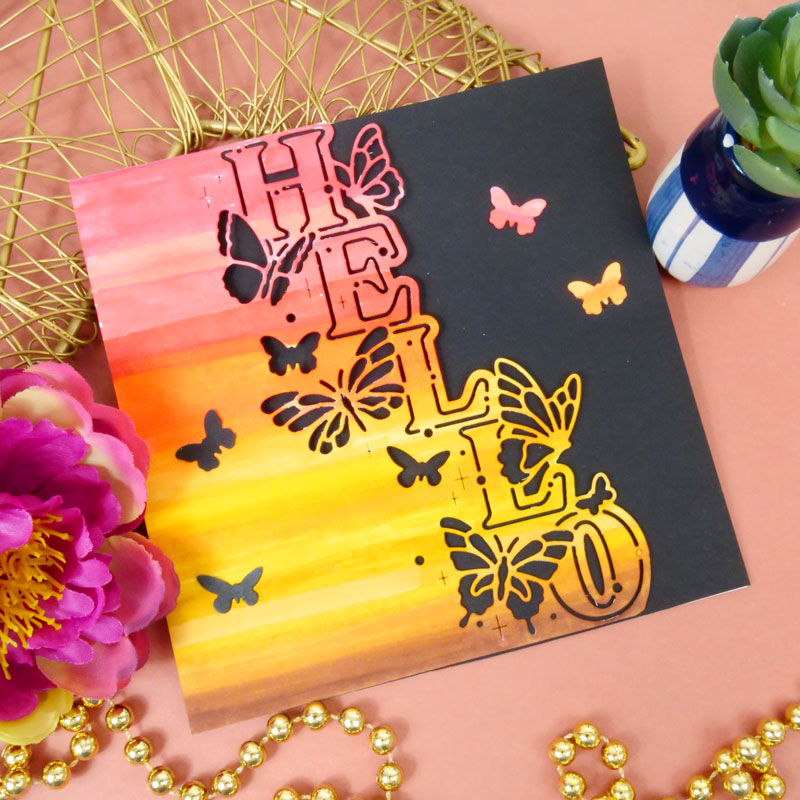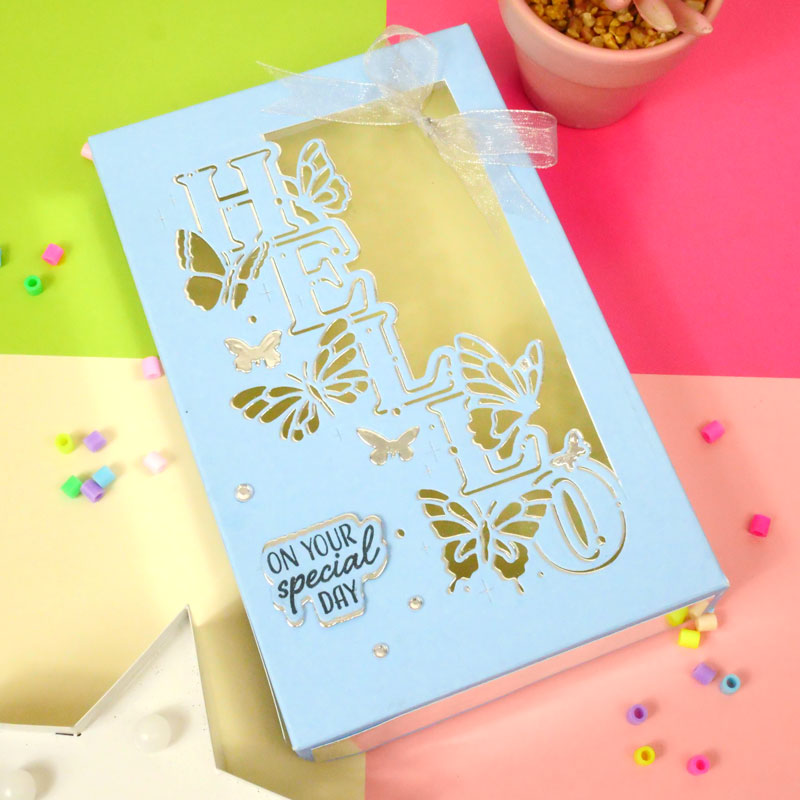 - Cuts a stunning 'Hello' sentiment design into card fronts