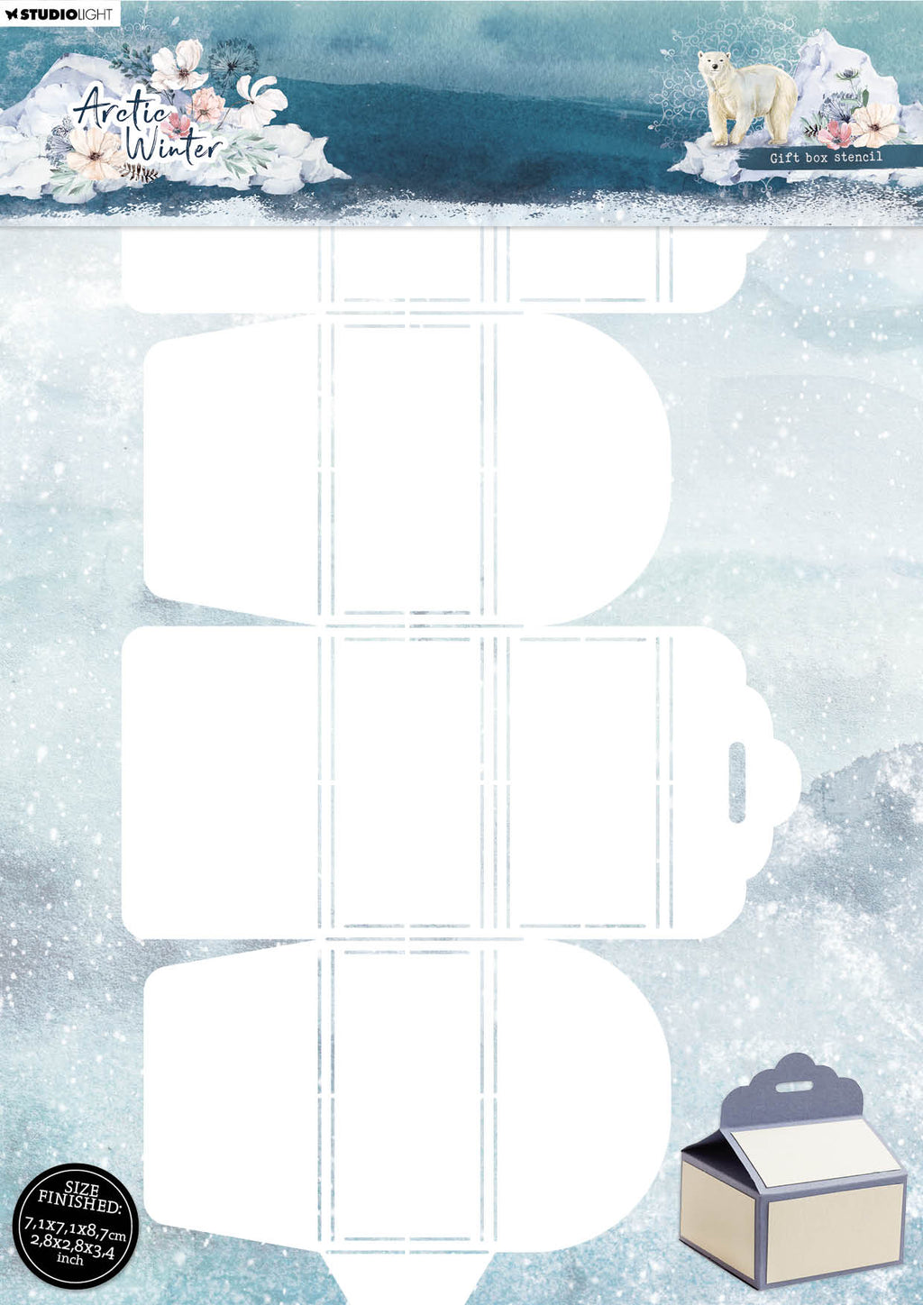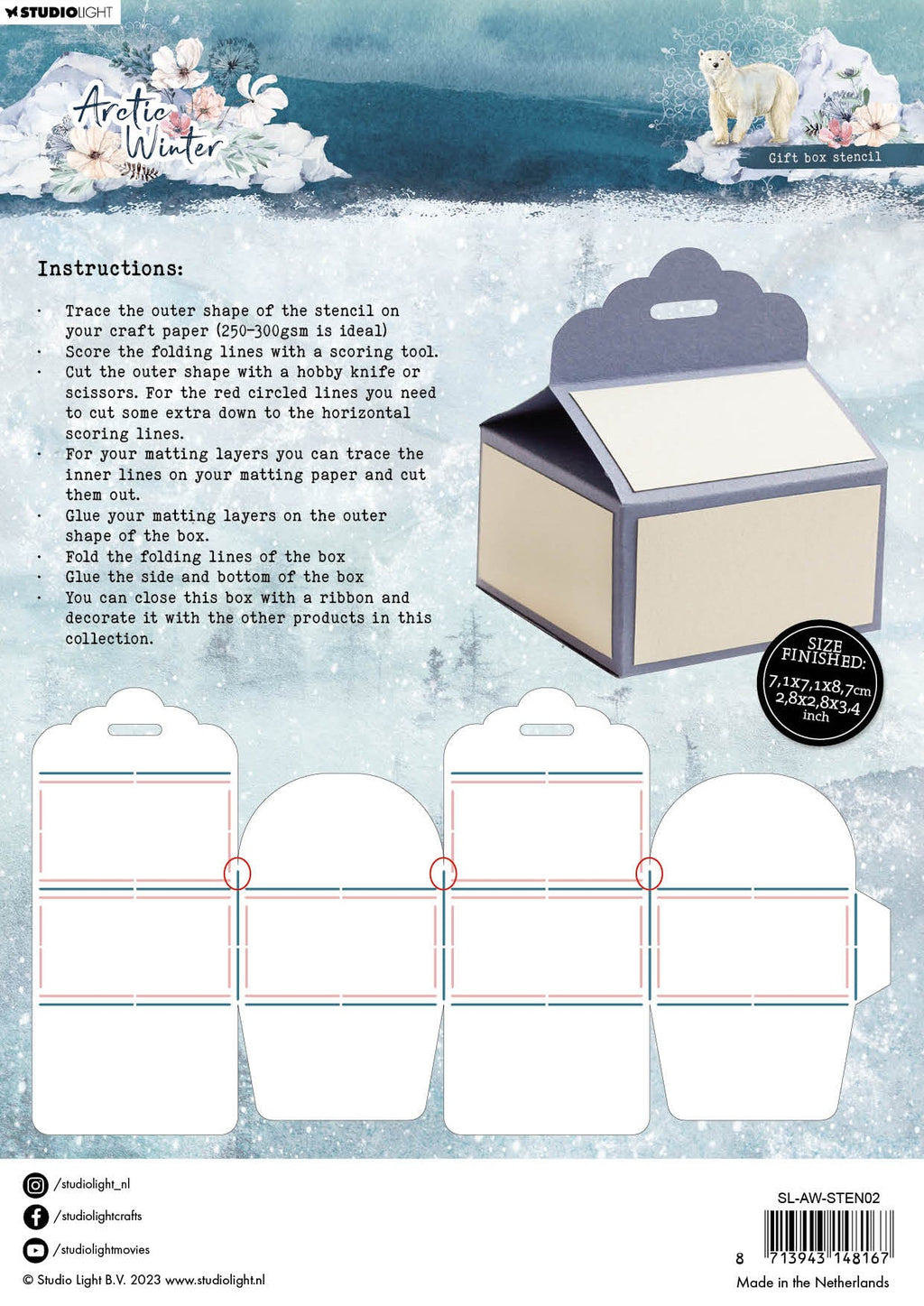 Create your own giftbox with this stencil set. This set will give you the lines to score for folding so you get the perfect shape every time. Part of the Artic Winter Collection. Finished size: 7.1 x 7.1 x 8.7 cm, 1 pc.
