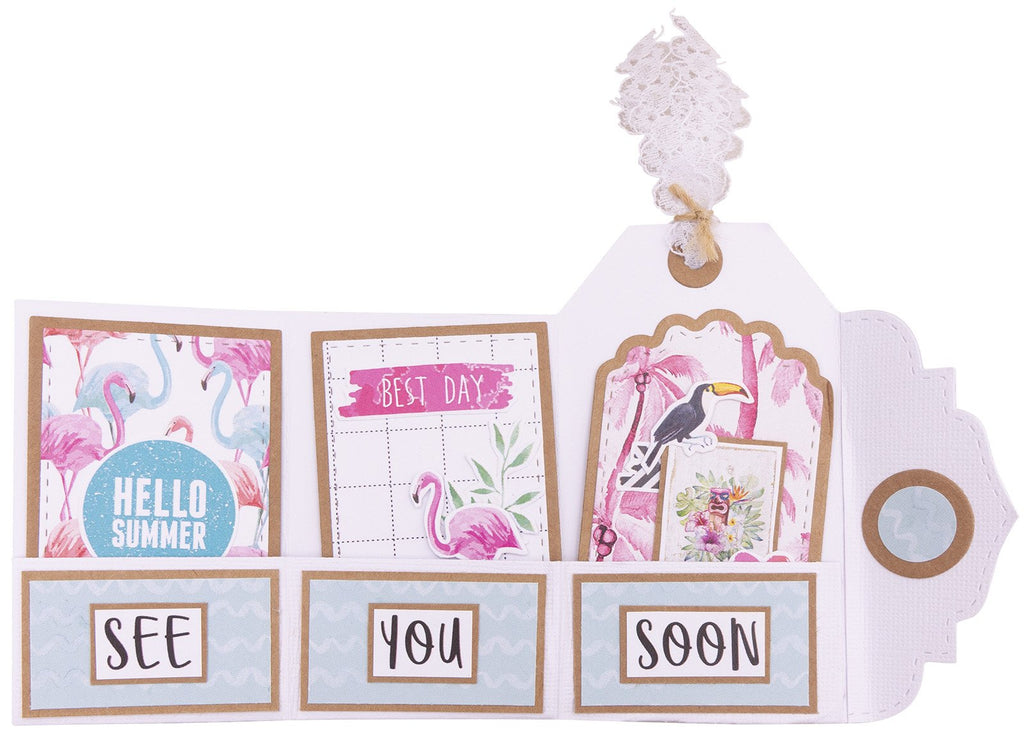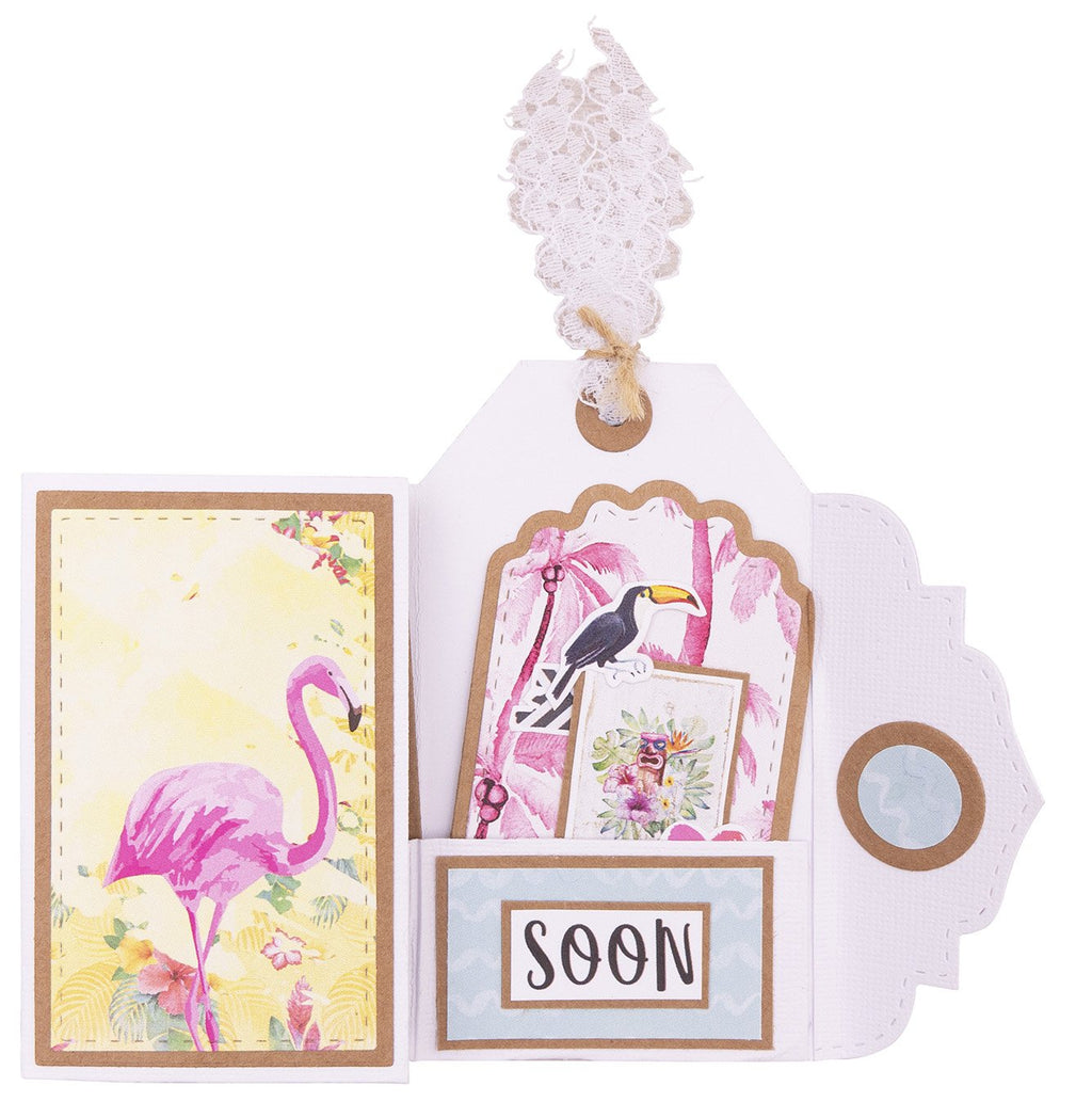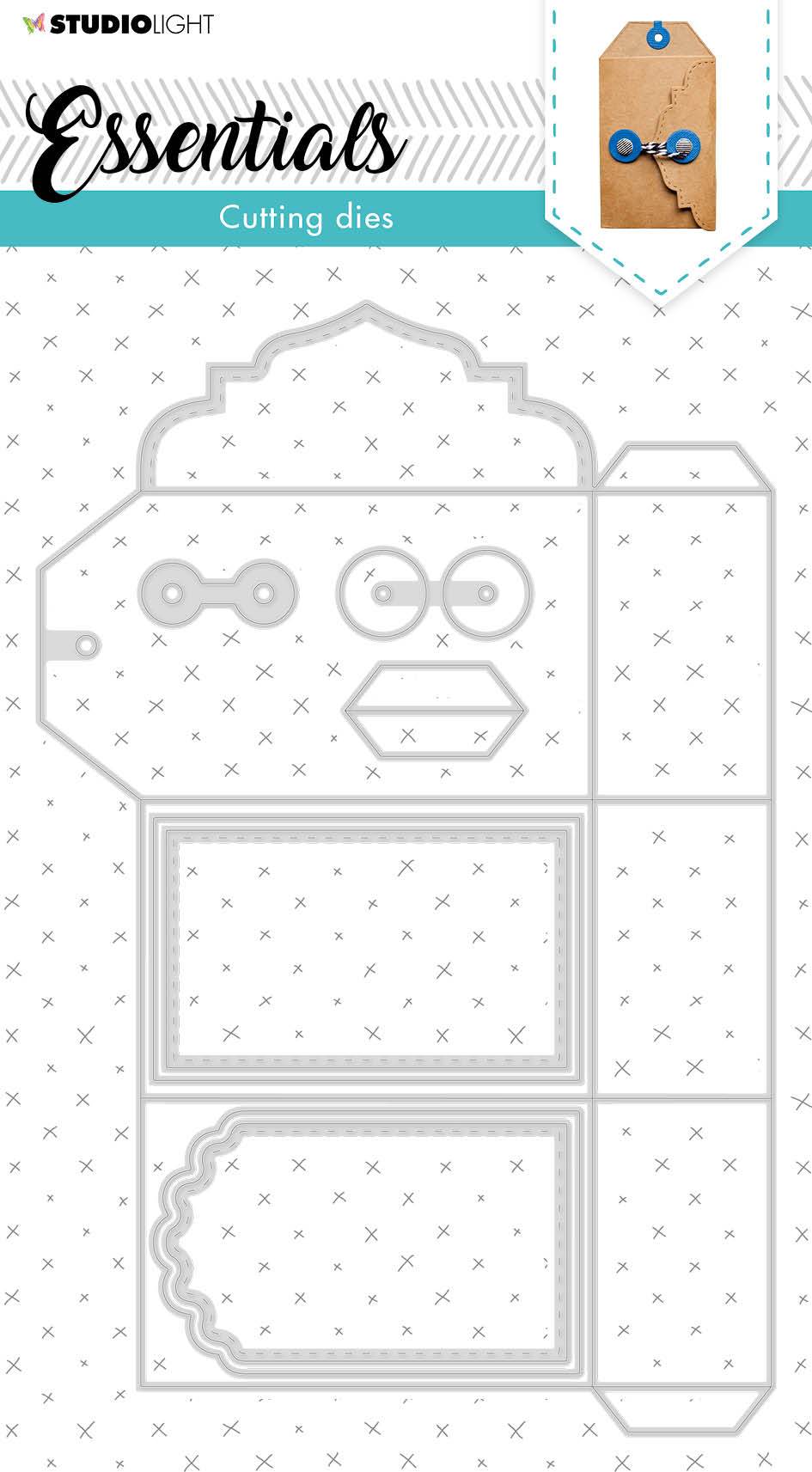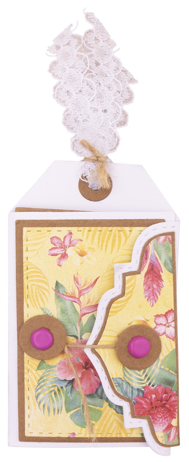 This cutting die creates a tag pocket envelope for mini shapes.  It also fits gift cards and film photo pictures. Instructions are on the back of the inlay.