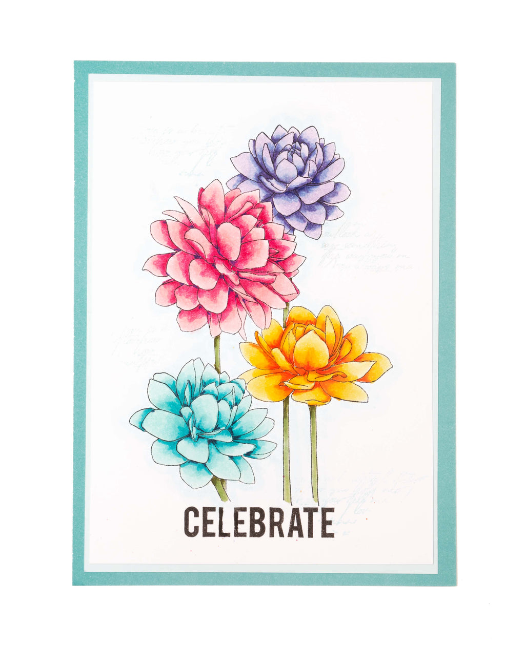 An intricately drawn clear stamp depicting four dahlias perfect for creating unique, beautiful, and personalized works of art. Perfect for making beautiful cards and paper crafts. Make every project special with this must-have stamp set.